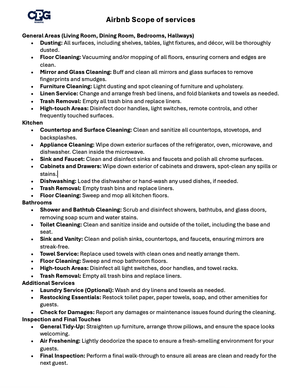 Keep your Airbnb spotless and guest-ready with our professional cleaning services. At CPG, we specialize in thorough, efficient cleanings tailored to the needs of short-term rental hosts. From deep cleaning between stays to regular upkeep, we ensure your property shines for every guest. Let us handle the cleaning so you can focus on providing a five-star experience.